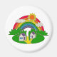 Bukolisk illustration med 3D-effekt som visar landskapet i land och vissa kabiner på landsbygden under sol och regnbåge