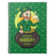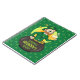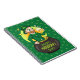 Anteckningsbok med en Illustration av en leprechaun med leprechaun i grönt kostym, en bockslips och en bowlareare hatt medan sitta ligger i en deg o’ guld och med en punkt av öl, med regn av gult, grönt och orange i bakgrunden. Bilden placeras över en sömlös mörk grönt bakgrund med schampar. En perfekt som firar Saint patrick's day!