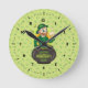 Tecknad leprechaun i en depån i guld som håller en rund klocka