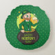 Tecknad leprechaun i en depån i guld som håller en rund kudde
