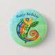 Den här rundknappens bakåtknapp har en tecknad ödla med stort ögon ljusa färger av gult, orange, blått och grönt som håller en käpp med en grönt löv på en blandad blå och grönt bakgrund. Anpassa texten med mallen.