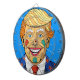 En tecknad man med blondinskt hår med en clown ansikte som leende på kostym.