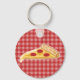 Den grå tecknaden illustrerar ett fet pizzasega med tre delara salami och en hel del ost ovanpå. Bakgrunden till färg är röd med vit plaid mönster.