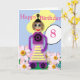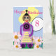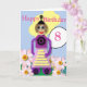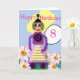 Detta helt redigerbara barns födelsedagskort har en färgstark tecknad-flickrobot med bildtexten "Grattis på födelsedagen" och nummer 8. Innertexten lyder "Ha en Underbar dag"
