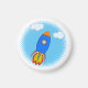 Anpassningsbar magneter med raket tecknad och moln med tidningspapper som påverkar blå bakgrund. Ursprunglig design. Dekoridé för barn.