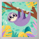Trögdjur i tecknad film hänger upp och ner från en gren med ett sömnigt leende. Överdrivna googly-ögon