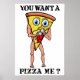 En rolig tecknad på en pizza med boxningshandskar. pizzan har stort blått ögon och står upp redot för en boxningsmatch. Sloganen lyder "du vill ha pizza me".