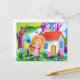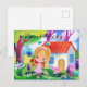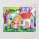 Tecknad söt flicka och hus i skogen. Blommor sagoberättelse