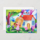 Tecknad söt flicka och hus i skogen. Blommor saga