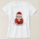 T-shirt för kvinnor med en illustration av en söt leende lycklig-flicka med svart kort-hår, som bär röd och vit Jultomten-dräkt och håller en present; med redigerbar textmall för ditt namn eller meddelande, juldesign med röd bakgrund och helgdagar