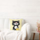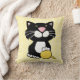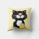 Cute gult och vit polka punkt dekorativ kudde med tecknad grafik av en svartvit tuxedo-katt med gult boll av garn. Anpassa för att lägga till egen text.