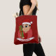 Tote-väskan med en illustration av en söt leende lycklig småbarn-pojke, han bär rött och vitt Jultomten-kostym och håller ett tält. Med en redigerbar textmall för ditt namn eller meddelande, utformar helgdagar för jul med röd bakgrund