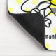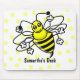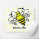 En nätt vit med gula polkadots täcker den hela mousepaden. En tecknadhumla sitter i centrera med ett utrymme precis under honom för ett namn eller ett meddelande.