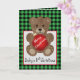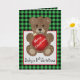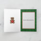 Denna bedårande teddybjörn är perfekt för bebis första högtid eller vilken liten unge som helst. Denna mysiga, bruna björn håller en röd julgransprydnad som det står "God Jul" på. Bakgrunden är en grön och svart rutig pläd med en vit låda. Texten längst ned på framsidan och texten inuti kan anpassas.