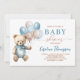 Trendig blå pojke bebis kalas inbjudan med söt teddybjörn med blå och brun pastell ballonger, "Det är en pojke" formulering och pastellblå rutig mönster i bakgrunden. Matchande föremål finns tillgängliga.
