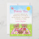 Denna söta och fantasifulla tack-kort har söta björnar på picknick på en rosa rutig duk med godsaker som honung, vattenmelon, jordgubbssylt, lemonad och paj. I bakgrunden syns en klar blå himmel och solsken, fjärilar och prästkragar. Texten kombinerar dekorativa och serif-typsnitt för en stilren och modern look. Detta är perfekt för en vår- eller sommarfödelsedagsfest.