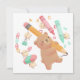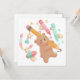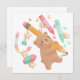 A cute illustration of a teddy bear carrying a pencil with fluffy monsters carrying other school supplies