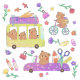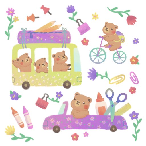 A cute illustration of a teddy bear carrying a pencil with fluffy monsters carrying other school supplies