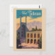 Teheran retro vektor resedesign i emblemstil. Teheran, Irans huvudstad, blandar modern stadsbild med forntida persisk historia och erbjuder besökarna en rik blandning av basarer, museer, bergsutsikter och ikonisk arkitektur som Azaditornet och Miladtornet.