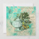 Söt vintage kollage har myntfärgad illustration av tekanna med bladfjäril och fjäril på grönt på pastellakvälla med svår bakgrund från ephemera.