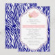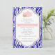 Tekannan kring Tea party och rosan vid zebra tryck, marinblått inbjudningskort för möhippan med en tekanna i rosa med ett motiv för vit blommigt, blommor, rosa, ram och marinblått, vitt zebra tryck mönster. Denna utformning av snyggten är en perfekt av anpassade för ett vår, sommar eller fall/höst-bröllop. Text i grått och vitt.
