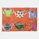 Vattenfärgtolkning av tekannor på en kökshandduk. Färgrikt och nyckfullt.