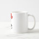Den vita bilden har tekopp och fink silhuett med röda hjärtballonger.