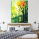 A imagem é uma pintura abstrata e texturizada que retrata um pôr do sol vibrante sobre a água. O sol laranja intenso é o ponto focal, refletindo-se na superfície escura da água com pinceladas de luz. A paleta de cores transita do laranja e amarelo quentes, que representam o céu no crepúsculo, para tons mais frios de azul e preto que dominam a porção superior direita e a parte inferior da pintura, sugerindo a transição do dia para a noite e a presença da paisagem noturna ou da água. A textura proeminente adiciona profundidade e dramaticidade à cena, com acúmulos de tinta que podem evocar a sensação das nuvens, da superfície da água ou até mesmo da terra ou rochas na margem. A obra evoca uma atmosfera de intensidade e transição, capturando a beleza dramática de um pôr do sol.