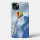 Drake i fyra färger. Diamantformad drake flyger bland molnen. Röda, gula, gröna och blåa ränder på draken.
