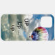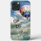 Regnbågsmönstrad varmluftsballong som stiger upp i de fluffiga vita molnen på en blå himmel. Texten lyder "UPP ... Upp ... upp ..."