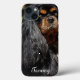 Telefontäckning, avalliansspaniel, Kung Charles Cavalier Spanska. Kavalierspaniel är planetens sötaste hundar! Här är ett vackert svart och brunt Cavalier-redo för att behålla din mobila utan repor. Vivid färg och många intressanta detaljer. iPhone 11 12 13 fodral med foto och namnPersonalisera med namn. Välj höger fodral för iPhone 11, 12 eller 13. Cavalier Spain Art av Sång Kor