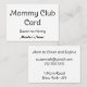 Cute mamma-kontaktkort med snyggtens svarta text med handskript för trendig: Membership Klubb Card för Mammor. Använda de här roligt mamma-telefonkorten att bygga ett nätverk av nya vänner och spela data - ett underbart sätt att få dina barn uppmärksammade och hitta mammans vänner! Fyll i informationen. Berätta om du behöver hjälp med den här designen.