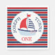 Cute boys nautiskt tema 1:a födelsedag personlig pappra blöjor med segelbåt, på vit ram och marin bakgrund och rödstrimmig bakgrund. Anpassa texten själv när du beställer. Roligt bord dekorationer för nautiskt temafald.