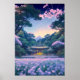 Ett häpnadsväckande trätempel står på kant i en lush grönt skog, med fält av vibrerande lila blommor framför. Templet visar en känsla av lugn och fred och blandar sig sömlöst med sin naturliga omgivning. Träd rostar sig försiktigt i brisen, och det avlägsna ljud i en babblingbak kan höras.