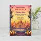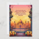 Framsidan på inbjudan visar ett fantastiskt tempel i bakgrunden, stående graciöst mot en strålande himmel som övergår från mjukt gult till varmt rosa, vilket frammanar skönheten i en Diwali-solnedgång. I förgrunden lyser flera tända ljus mjukt, och kastar ett stillsamt ljus som förstärker den fredliga atmosfären. Templet, rikt detaljerat, tillför en touch av helig elegans till designen, medan himlens varma färger skapar en känsla av firande och stillhet. Evenemangets detaljer presenteras i ett raffinerat skrivsätt, varsamt placerade över scenen. Baksidan av kortet fortsätter det mjuka, lysande temat, och erbjuder utrymme för anpassningsbar text och Diwali-önskningar, med subtila dekorativa detaljer som knyter