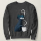En svart katt med blå högdagrar testar teets temperatur med hennes svan. Ånga stiger från hennes kopp.