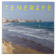 Ett vackert foto av stranden med byn El Médano i bakgrunden på Tenerife, som är tryckt på en keramisk bricka i souvenir.