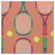 Det här är en färgfull bild mönster av röda och grönt tennisrackets och tennis bollar av klassisk färg på en terracotta-bakgrund, som symboliserar en lerdomstol. Du kan ändra bakgrunden färg genom att klicka på knappen "Anpassa den!". Där kan du också ändra storleken på plattorna för att justera hur stor teckning du behöver.