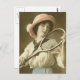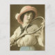 Vintage färgade fotografi av en söt ung kvinna som har en tennisracket.