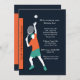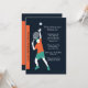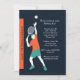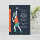 Entema inbjudan för en tennisentusiast födelsedag. Kortet presenterar en male tennisspelare omkring för att tjäna som bollen. De djärva orange-, kricka- och vitfärgerna hoppar ut mot den svart bakgrunden.