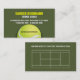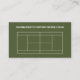 Huruvida är den på gräs, lera, eller en hård domstol, leken älskas av miljoner. På denna visitkort kantjusteras en tennisboll av på grunden av kortet på en grön hård domstol. Huvudsaklig information om kontakt skrivar ut mot bakgrunden med informationsprinting om webben på bollen sig själv. De omvända showsna ett diagram av en tennisbana på den hårda domstolen. En tagline eller andra informationstryck över. Perfekt för tennislagledarear, lag, tennisklubbar, sportslig bra diversehandel eller någon sportåterförsäljare. Tillgängligt med att matcha produkter.