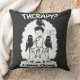 En svart och vit t-shirt-design med en minimalistisk tecknad-stil-mänsklig figur i lugn och ro på en stump i träd, omgiven av fyra känslolösa kråkor - en på personens huvud, en annan med ett litet "hjälptecken" och två andra som tittar uppifrån. Människans figur har dödpunkten i ögon och är på väg att tappa kaffe, helt utan problem. Ovanför eller under illustrationen står följande: "Terapi? Jag har Kråkor." Konsten ska vara ren, svart och vit med hög kontrast utan gråskala eller skuggning, optimerad för fet, skärm-tryckt humor.