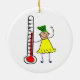 Nyckfull illustration för gullig tecknad av ett lyckligt liten flickainnehav en jätte- termometer. Lätt skräddarsy och välj din egna bakgrundsfärg eller tillfoga text. Avbilda tillgängligt på olika gåvor och produkter.