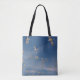 Det ursprungliga fotot av ZoeSPEAK på Tote Bag fångar en flock av lyktor som lyfter från stranden och som är på väg ut över havet. De vita fåglarna, mot bakgrund av den sena eftermiddagen sol, står ut mot blå himmel. Mönstren har svarta fjädrar på huvudena och vinge kant, och smidigt svan som sväljer svan.