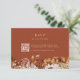 Terracotta Autumn QR Code OSA kort. Det är enkelt att svara på din speciella dag med den här QR-OSA kort, som innehåller vackra, handmålade vattenfärgsverk av bränd orange och terracotta löv, kräm och beige dahlias, och slående koppar och rost-färgad ro. Den varma kopparbakgrunden förbättrar designen, medan den samordnande mönster på baksidan ger en snyggt. Förenkla gästsvaren utan att göra avkall på elegansen - anpassa dina nu.