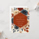 This design features a rich tapestry of deep terracotta, muted blues, and soft cream blooms. The arrangement evokes an autumnal romance with botanical elements and a warm, inviting aesthetic. Hints of deeper rust and subtle foliage add depth and texture to the composition.