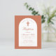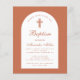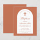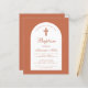 En baptisminbjudan till en pojkes doktor. På ett modernt färg, terracotta brunt, har det en vit båge med terra cotta text inuti. Ord-baptism och namn är skrivna i ett kalligrafiskt skript för elegant. Den första raden är bågtext.