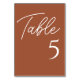 Moderna bordsnummer höjer din bröllopsmottagning bord décor. Utformningen har ett typsnitt för elegant i vitt på en bränd orange, jordtonsbakgrund i perfekten för ett fallbröllop eller banquet-evenemang. Beställ varje bordsnummer från samlingen eller redigera det här kortet för varje nummer som behövs. Utformningen skrivs ut på båda sidor.