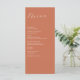 Ett vackert designläge med elegant-skript kalligrafi-typografi på en terracotta bränd bakgrund av orangen. Perfekt för alla som kärlek modernt minimalistiskt utformar. En snyggt och trendig bröllop-menykortsdesign med klassiskt inslag. Det finns också möjlighet att matcha bröllopsinbjudningar och andra artiklar i kontorsartiklar.