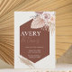 Make a bold yet refined statement with this terracotta geometric boho wedding invitation featuring soft blush roses and delicate dried foliage. A rich earthy hexagon backdrop highlights the couple’s names in elegant typography, creating a modern focal point that feels warm, romantic, and effortlessly stylish.